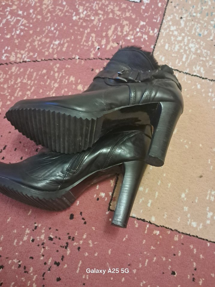 Tokalı, siyah renkte, yüksek topuklu kadın botları. Kauçuk malzemeden yapılmış gotik tarzda, cesur bir görünüm sunar.