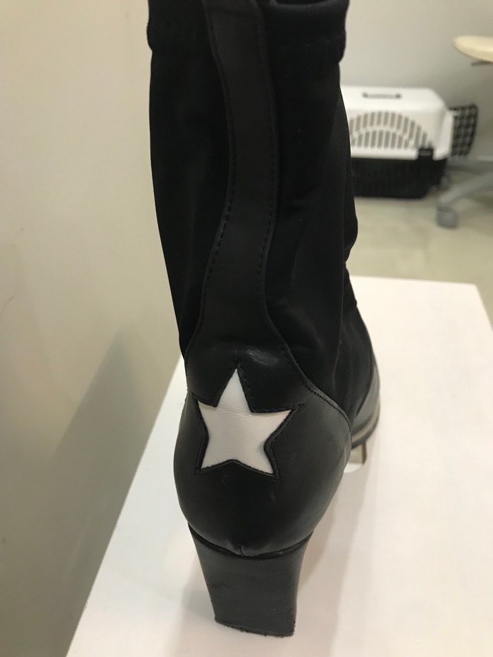 Pelinin ayakkabıları siyah, yüksek topuklu kadın çizme. Arkasında baskılı yıldız deseni ve tokalı detay bulunur, avant-garde ve gotik tarzlara uygundur.