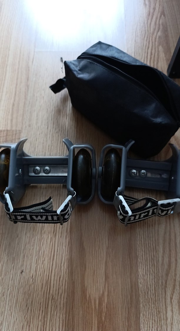 Tokalı, siyah ve gri renklerde, kauçuk malzemeden yapılmış topuk pateni. Spor için uygundur ve taşıma çantası ile birlikte gelir. ⛸️