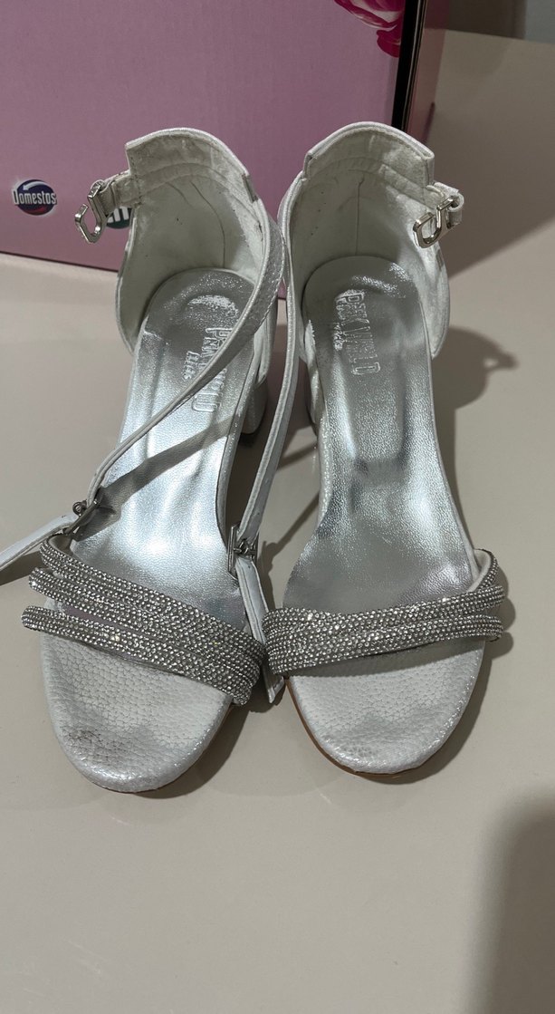 beyaz topuklu ayakkabılar, metal tokalarla süslenmiş, düğünler için şık ve göz alıcı bir tasarım.