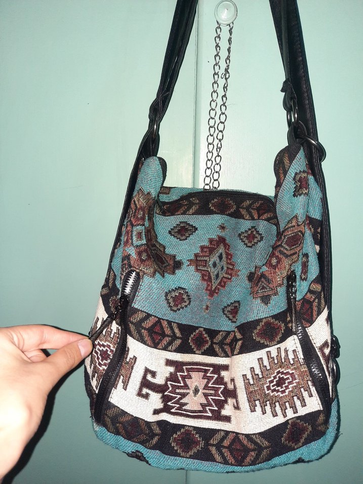 Tokalı, desenli ve koyu turkuaz renkli tekstil malzemeden yapılmış bohem tarzda kadın çantasıdır. otantik çanta kirli değil Sadece çekim açısından dolayı öyle görünüyor merak ettiklerinizi sorabilirsiniz