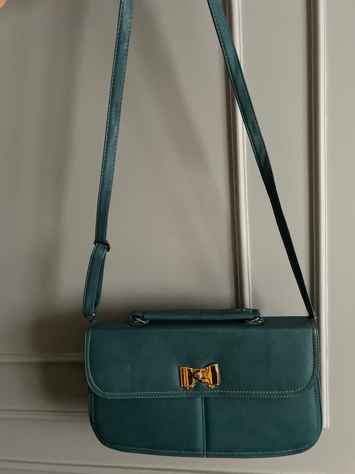Parlak yüzeyli turkuaz deri kadın çanta, tokalı detayıyla minimalist ve modern klasik tarzda, günlük kullanıma uygundur.