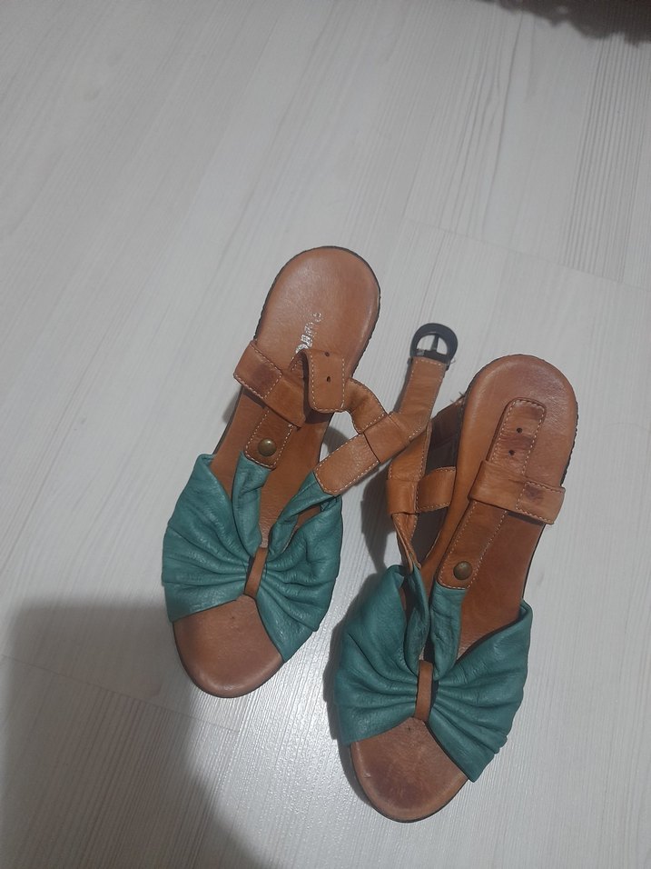 Tokalı kayışlara sahip turkuaz dolgu topuklu sandaletler. Bohem tarzı, retro ve minimalist dokunuşlarla günlük kullanıma uygun.