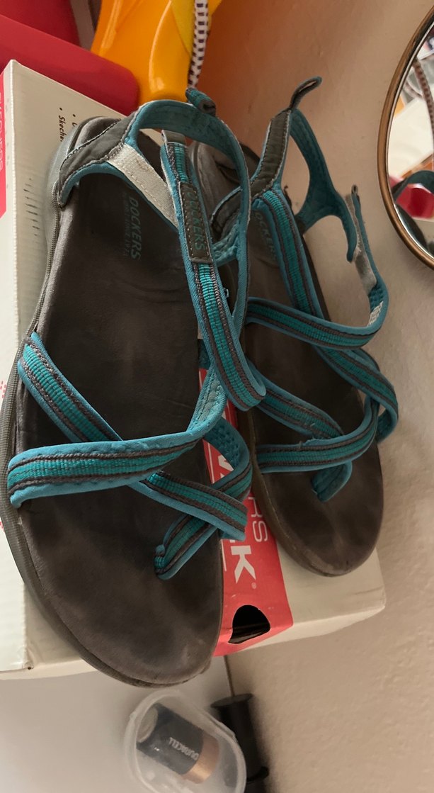 Tokalı bantları ve dolgu topuklu koyu turkuaz renkte kauçuk malzemeden yapılmış kadın sandaletleri, bohem tarzı ve athleisure rahatlığını dış mekan kullanımı için birleştirir.