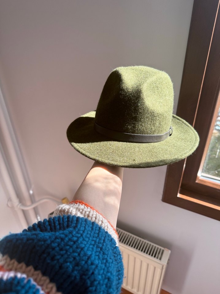 Yumuşak yünden yapılmış, tokalı ve haki renkte, bohem tarzına uygun rahat kadın şapkası.