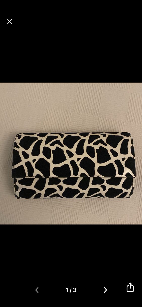 Suni kumaştan yapılmış, tokalı, bej ve siyah zebra desenli kadın portföy çanta. Günlük kullanıma uygun, çağdaş ve minimalist tarzda.