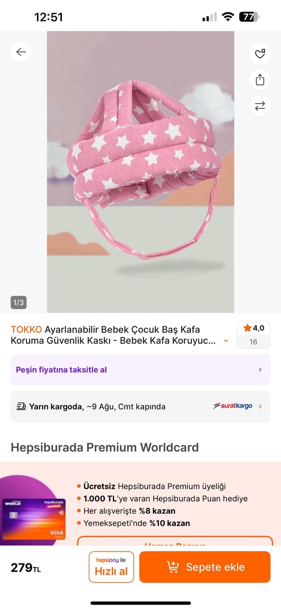 Tokko ayarlanabilir bebek ve çocuk baş koruyucu kask, yumuşak sentetik kumaştan üretilmiş, pastel pembe yıldız desenlidir. Hiç kullanamadım bebem kafasından çıkardı