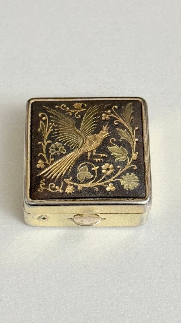 Altın kısımlar: gerçek altın varak (genelde 18–24 ayar, ama çok ince tabaka) Teknik: Metal yüzeye oyma yapılıp Kuş figürleri (özgürlük, bereket) • Çiçek ve yaprak desenleri (doğa, yaşam) • İşçilik: El işi, seri üretim değil Dönem & Köken • Tarih: Yaklaşık 1940–1970 arası Büyük olasılıkla İspanya (Toledo) • Alternatif olarak Japon damascene (Meiji sonrası) tarzına da yakın Enfiye kutusu