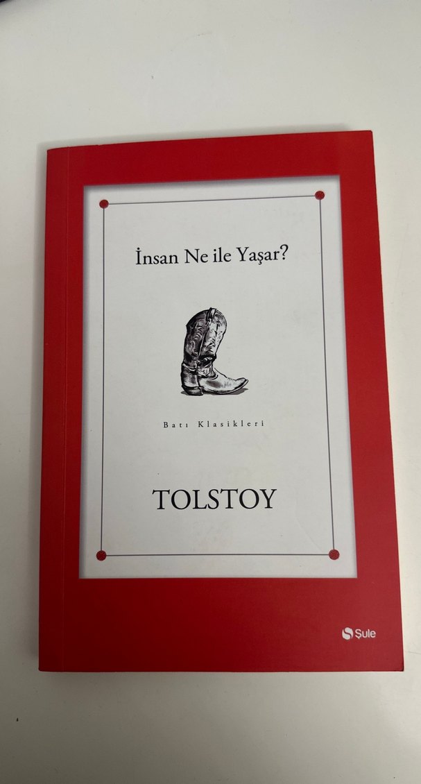 Tolstoy'un Batı Klasikleri serisinden "İnsan Ne ile Yaşar?" romanı, kırmızı çerçeveli kapağında bir çizimle sunuluyor.