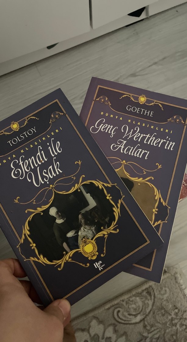 Tolstoy'un 'Efendi ile Uşak' ve Goethe'nin 'Genç Werther'in Acıları' adlı klasik romanları şık koyu kapaklı, altın detaylıdır.