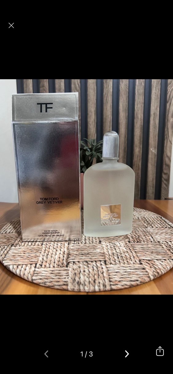 Tom Ford Grey Vetiver kadın parfümü, buzlu cam şişede ve gümüş kapakla sunulur, parlak gümüş kutuda paketlenmiştir.