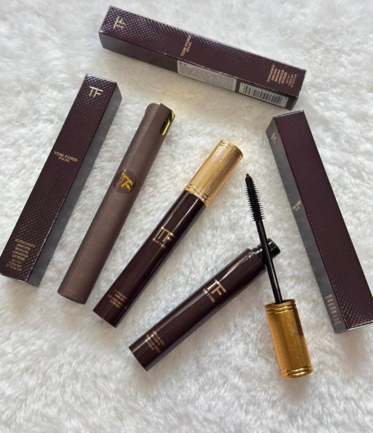 Tom Ford maskara, koyu bej renkte, şık ambalajda, belirgin kirpikler için hassas fırça ile.