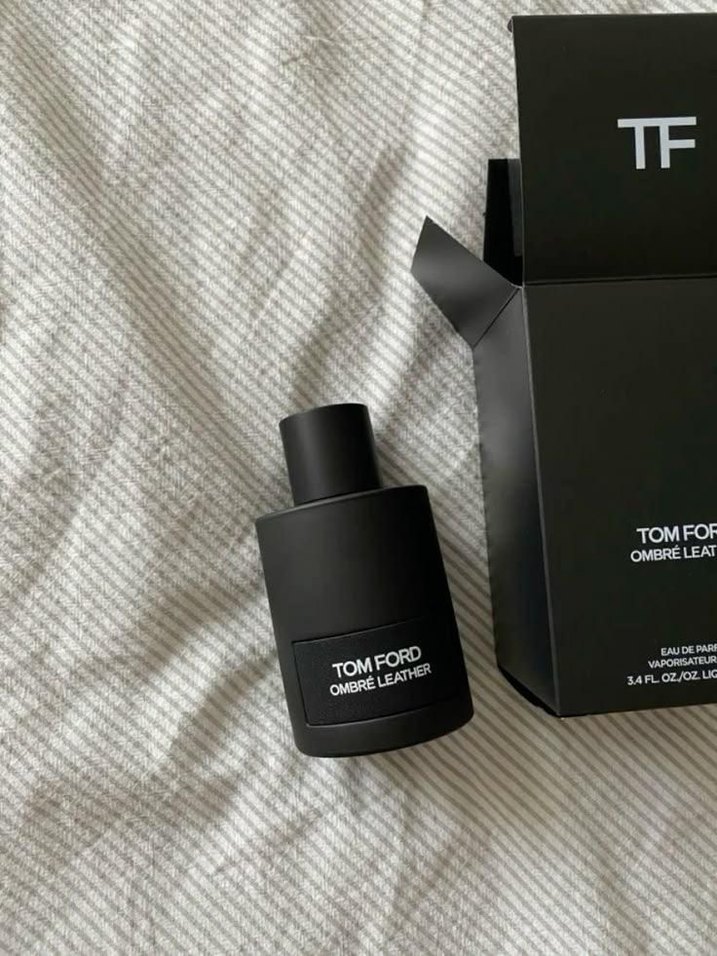 Minimalist tasarımlı siyah şişede Tom Ford Ombre Leather erkek parfümü. Çağdaş tarzda, ambalajda hafif gri tonlar bulunur.