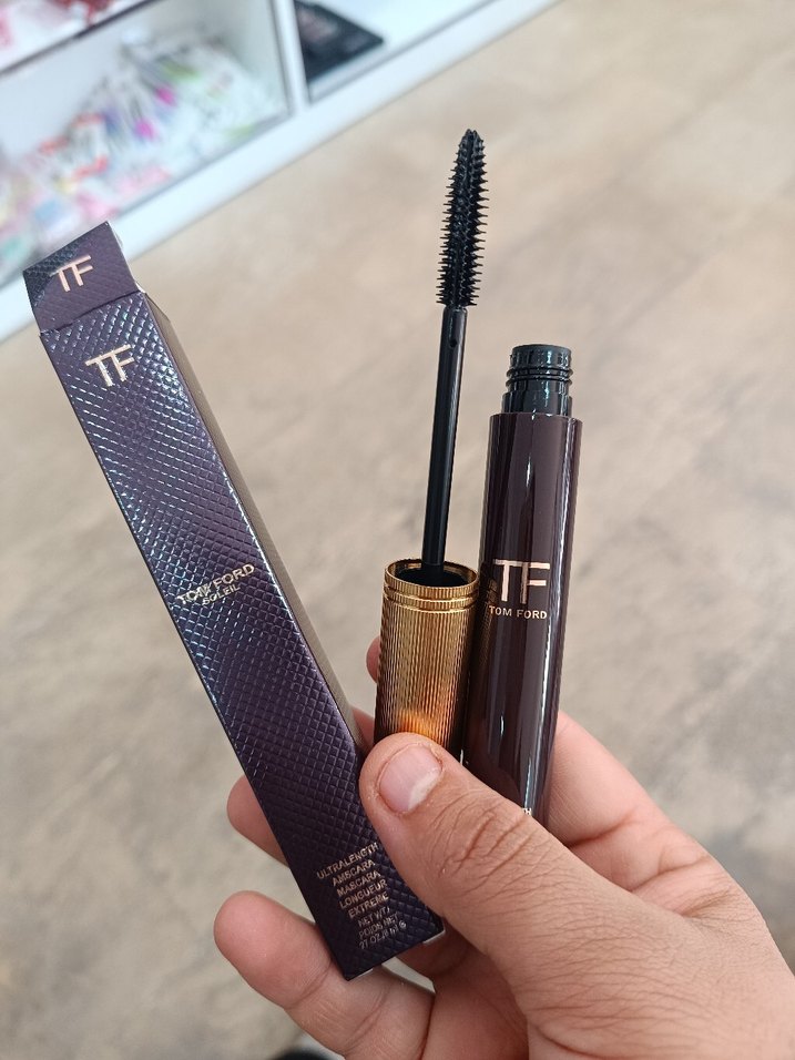 Tom Ford maskara, ince fırçasıyla hassas uygulama sağlar, yoğun siyah renk sunar. Şık bej ve altın renkli ambalajda. ✨