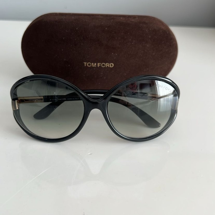Tom Ford siyah kadın güneş gözlüğü, modern klasik tarzda. Çerçevesi şeffaf ve koyu renk, koruyucu kılıf ile birlikte. ️