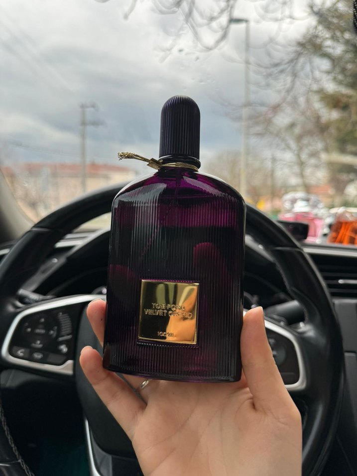 Tom Ford Velvet Orchid kadın parfümü, koyu mor şişede ve altın renkli etiketle, 100 ml hacmindedir. ✨