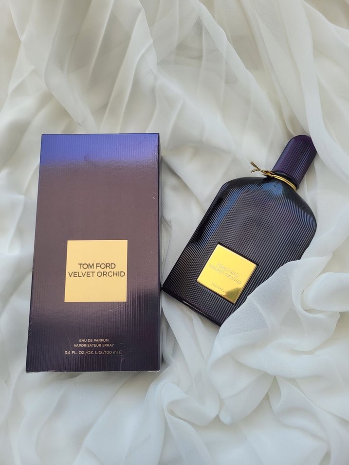 Tom Ford Velvet Orchid, altın etiketli şık koyu renk şişede kadınlar için eau de parfum. Zengin ve lüks bir koku sunar.