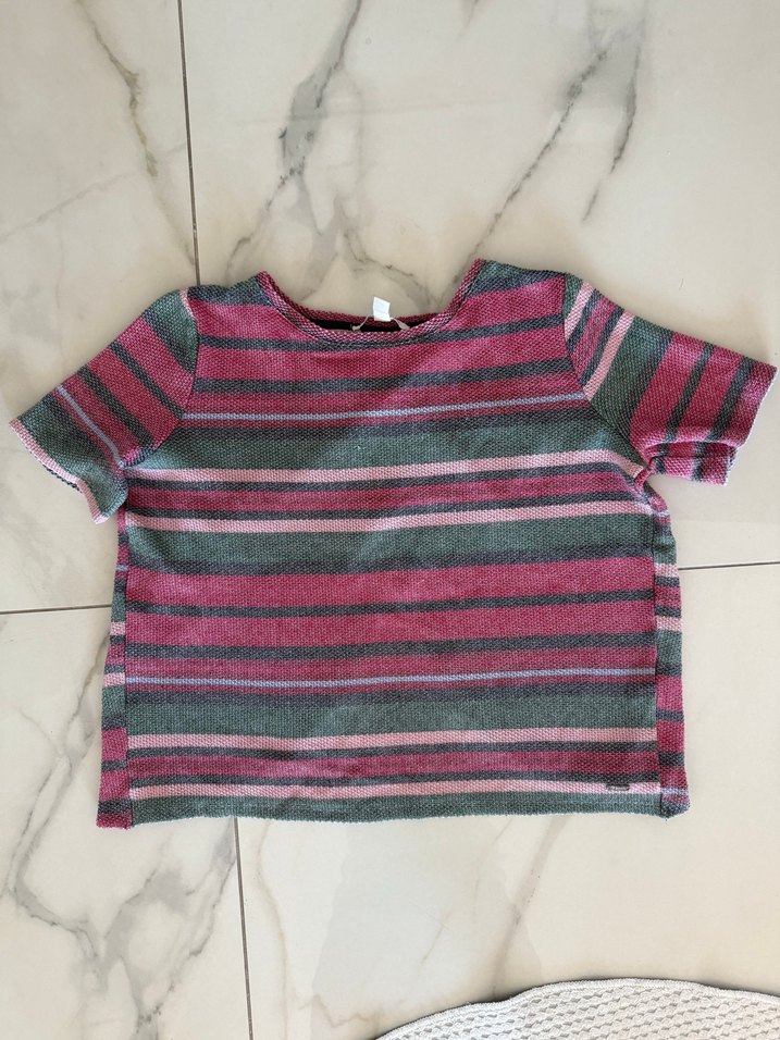 Tom Tailor- kısa kollu tişört, gevşek kesim ve yuvarlak yaka ile. Örgü dokuma, pembe ve gri yatay çizgili, rahat sokak tarzı için uygun. Sırt detaylı