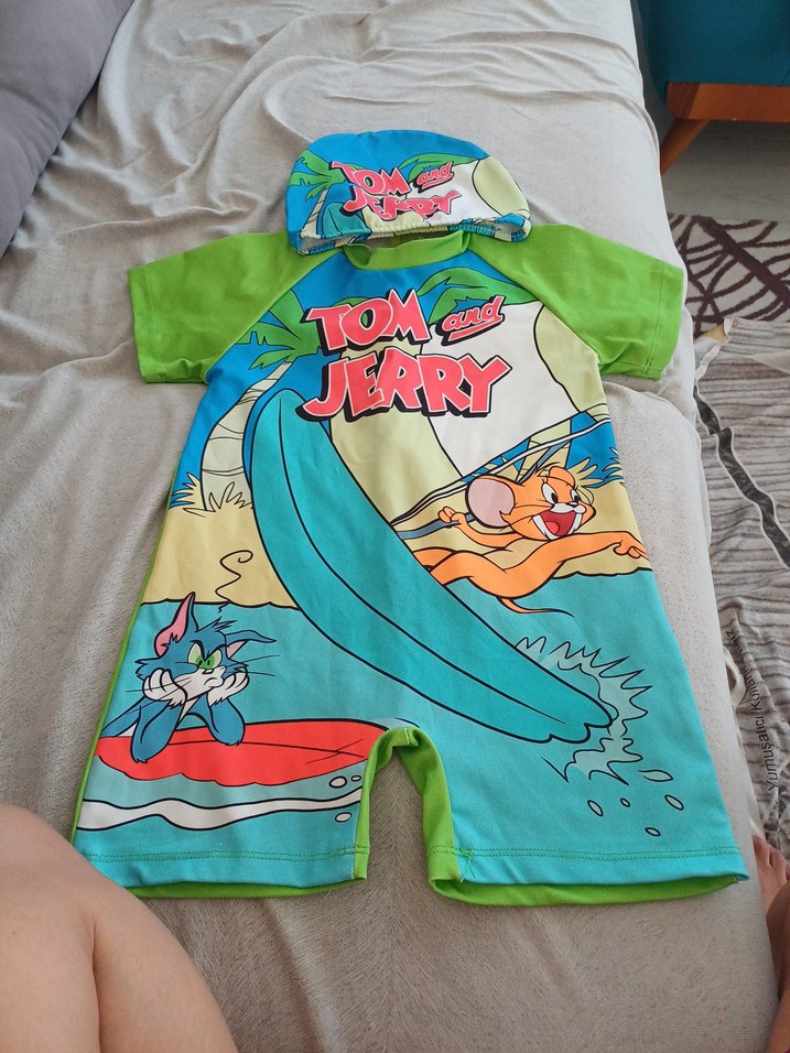 Kısa kollu, Tom ve Jerry baskılı, çok renkli erkek çocuk mayo ve uyumlu yüzme bonesi.