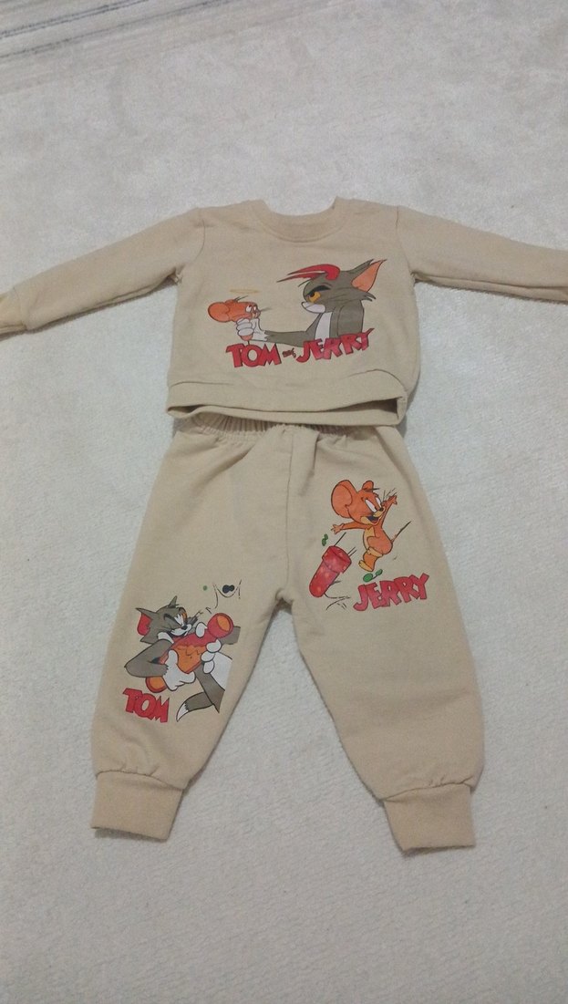 Tom ve Jerry baskılı, uzun kollu, bisiklet yaka, kahverengi pastel renkli, triko kumaştan yapılmış bol kesim çocuk takımı.