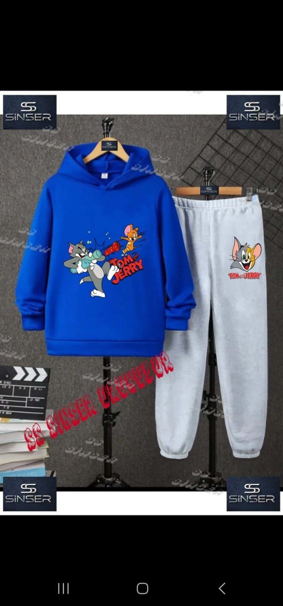 Renkli Tom ve Jerry baskılı mavi kapüşonlu üst ve gri eşofman altından oluşan, rahat kesim ve yumuşak kumaşlı çocuk takımı. Cırt cırt detaylı.
