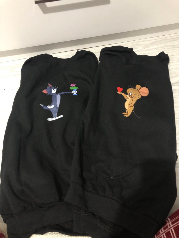 Velcro kapamalı, Tom ve Jerry baskılı siyah kedi kıyafetleri, sokak stili için uygun. Hiç giyilmemiş sevgili swetleri