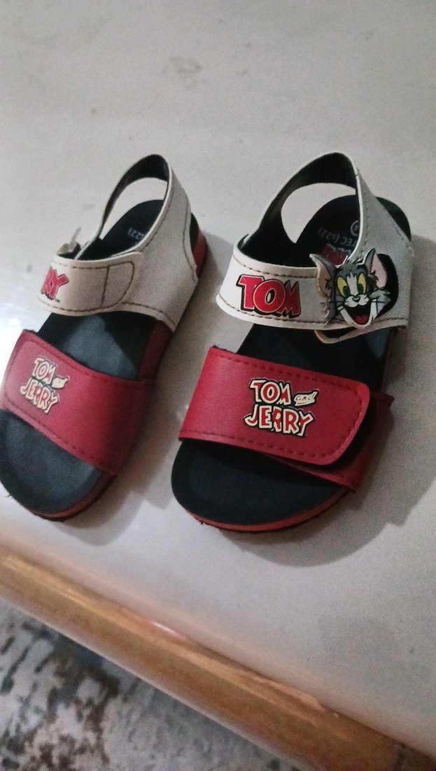 Tom ve Jerry baskılı, renkli erkek çocuk sandaletleri. Kauçuk malzeme ve tokalı bantlarla rahat kullanım sağlar.
