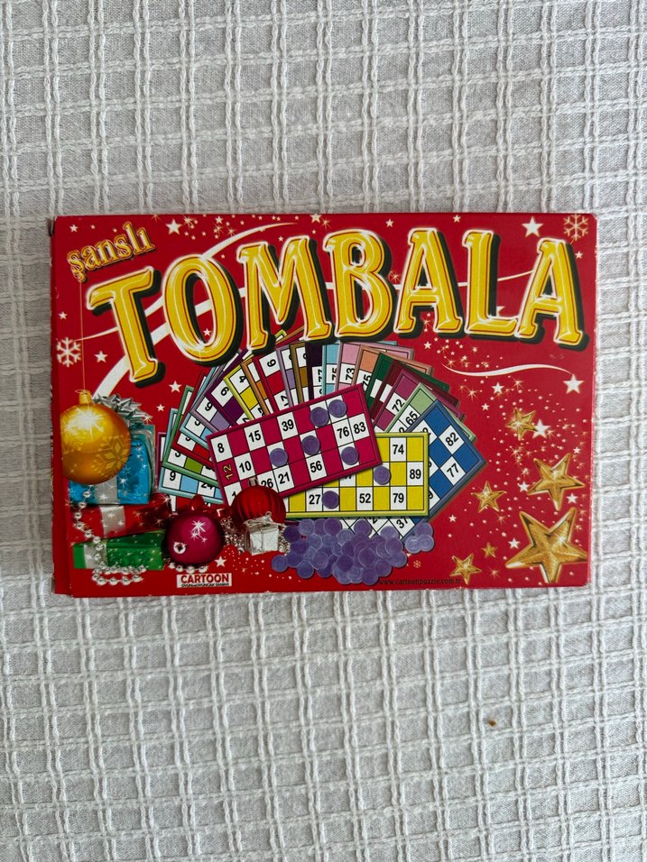Canlı kırmızı kutuda renkli Tombala oyun kartları ve parçaları bulunan masa oyunu.