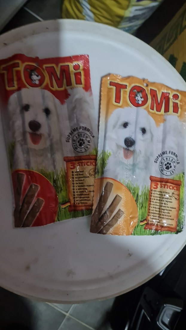TOMi köpek ödül çubukları, her pakette üç adet bulunan lezzetli atıştırmalıklardır. Evcil hayvanınızı ödüllendirmek için uygundur.