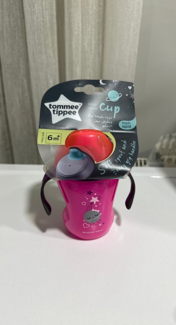 Tommee Tippee markalı, 6 ay ve üzeri bebekler için renkli, dökülme yapmayan uçlu ve kolay tutuşlu biberon bardak.