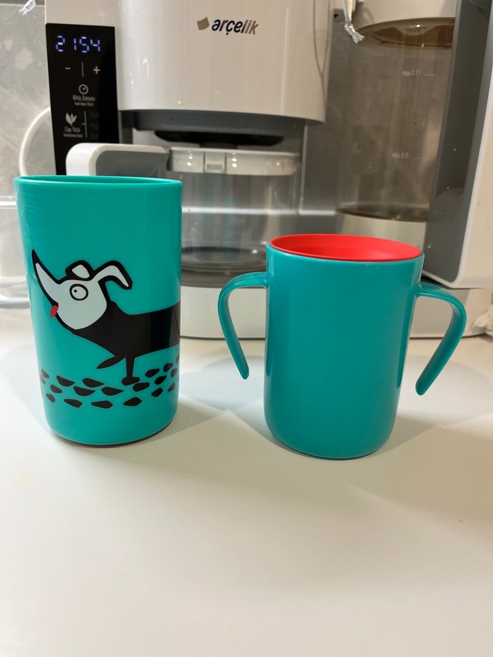 İki adet alıştırma bardağı. Biri zemine yapışarak devrilmiyor. Kulplu olanın kapağı var ters tutulduğunda da su dökülmüyor. Çocuk ağzına götürüp çekince su geliyor. İkiside kullanışlı bardaklar.