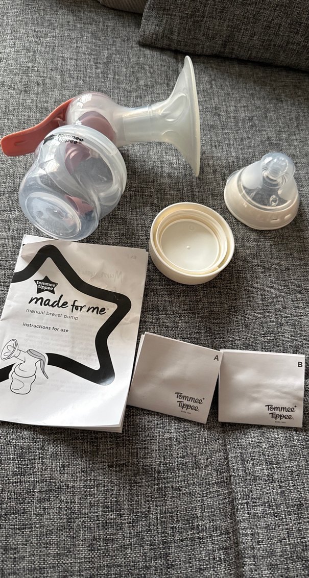 Tommee Tippee manuel göğüs pompası, gri ve beyaz renklerde, kullanımı kolay parçalara sahip ve talimatlar ile ek parçalar içerir. Pompa kısmının lastikleri biraz gevşek süt sağarken zorlanılabilir ama biberon kısmı çok işlevsel Daha önce hiç kullanılmadı. 150 ml. Lik
