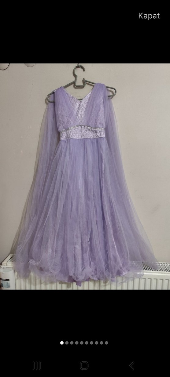 Uzun mor renkli, drapeli ve v yaka kesime sahip, kolsuz, ince kumaştan yapılmış şık abiye elbisedir.