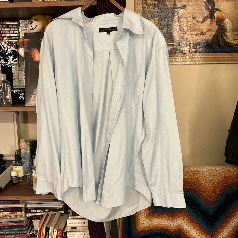 Uzun kollu, düğmeli, yakalı, bol kesim açık mavi pamuk gömlek.