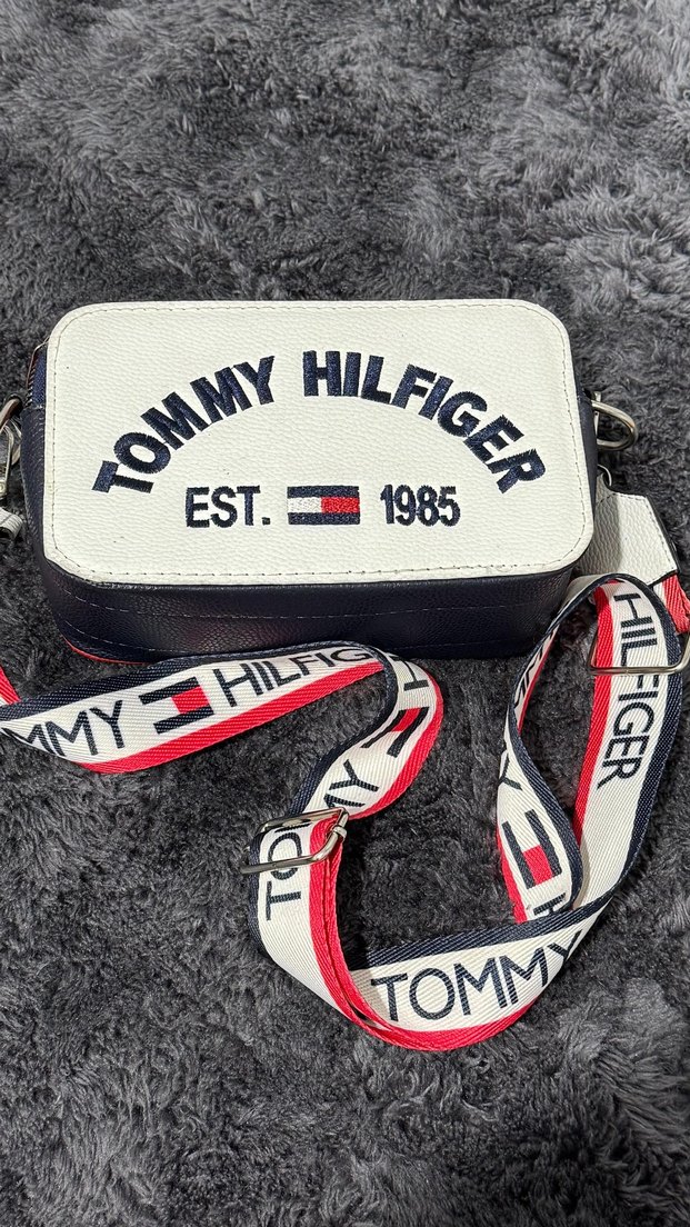Tommy Hilfiger baskılı, yumuşak ve sıcak dokulu kumaştan beyaz gri çapraz kadın çanta. Elastik ayarlanabilir askıya sahip, rahat sokak stili için uygundur.
