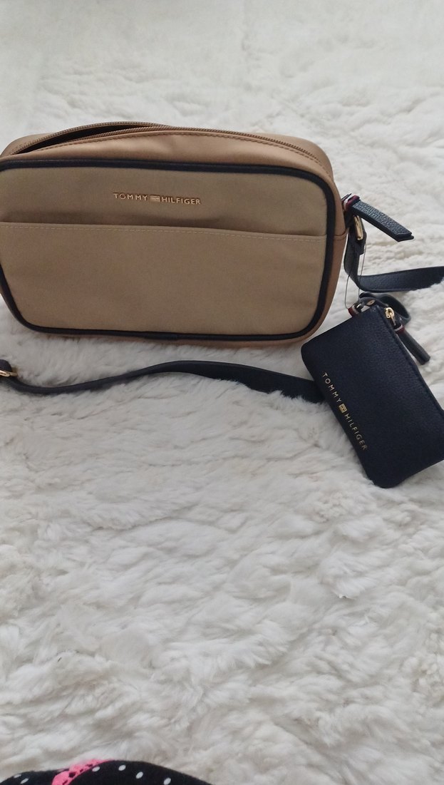 Tommy Hilfiger markalı, bej deri bel çantası, kemerli tasarımı ve küçük gri cüzdanı ile günlük kullanıma uygun, minimalist sokak tarzı bir ürün.