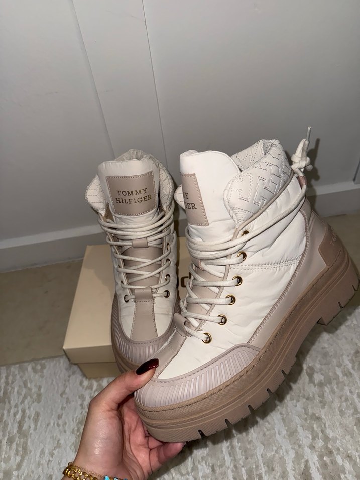 Tommy Hilfiger beyaz bağcıklı platform topuklu, dayanıklı kauçuk malzemeden yapılmış botlar. Günlük sokak stili için uygun pastel tonlarda, desensiz tasarım. SuperStep den alındı, 2 3 kere giydim, hiçbir kusuru yoktur, temizdir,