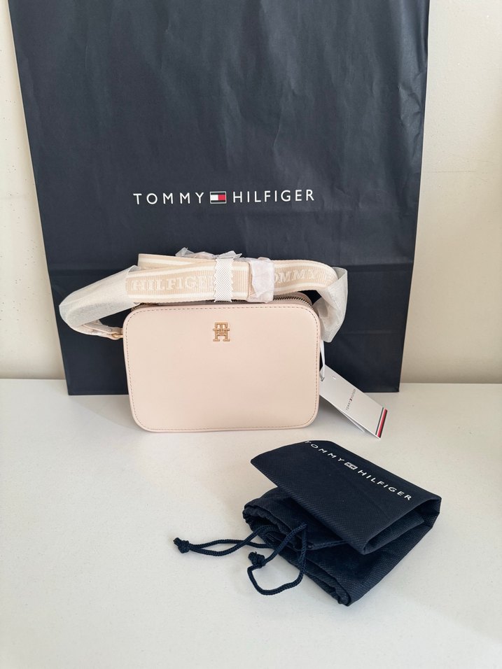 Tommy Hilfiger markalı, beyaz deri ve kemerli askılı kadın çapraz çanta. Minimalist ve desensiz tasarımıyla günlük sokak modasına uygun.