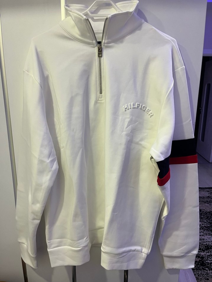 Tommy Hilfiger marka, fermuarlı yüksek yakalı, uzun kollu ve bol kesim erkek sweatshirt. Beyaz renkli, ve. Günlük rahat kullanım için uygun. En 63 cm boy 74 cm
