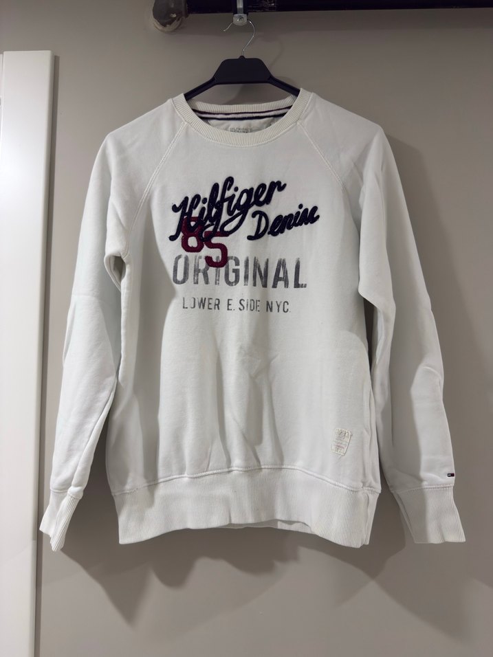Tommy Hilfiger beyaz pamuklu sweatshirt, uzun kollu ve yuvarlak yakalıdır. Rahat kesimi ve baskılı tasarımıyla günlük sokak stiline uygundur.
