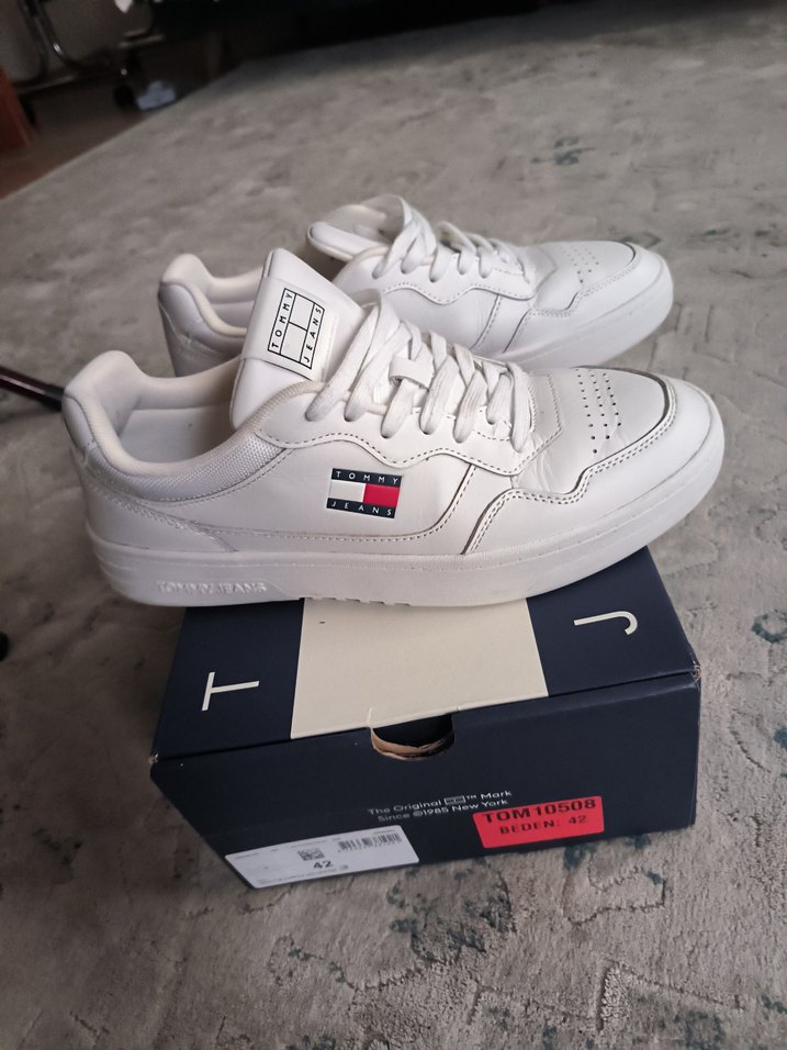 Tommy Hilfiger beyaz spor ayakkabısı, blok topuk ve kauçuk tabanlı, sportif ve günlük şıklık için ideal. Ürün 42 numaradır sadece bir kere kullanıldı