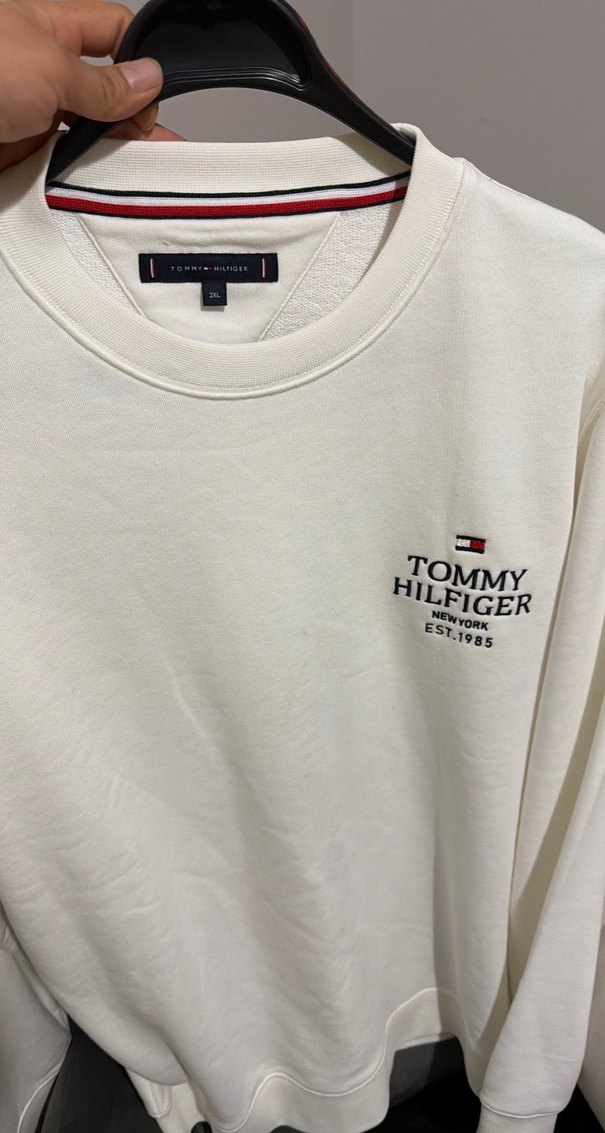 Tommy Hilfiger beyaz sweatshirt, yuvarlak yaka ve uzun kollu, pamuklu kumaştan. Baskılı logo ve rahat kesimiyle günlük sokak stiline uygun.