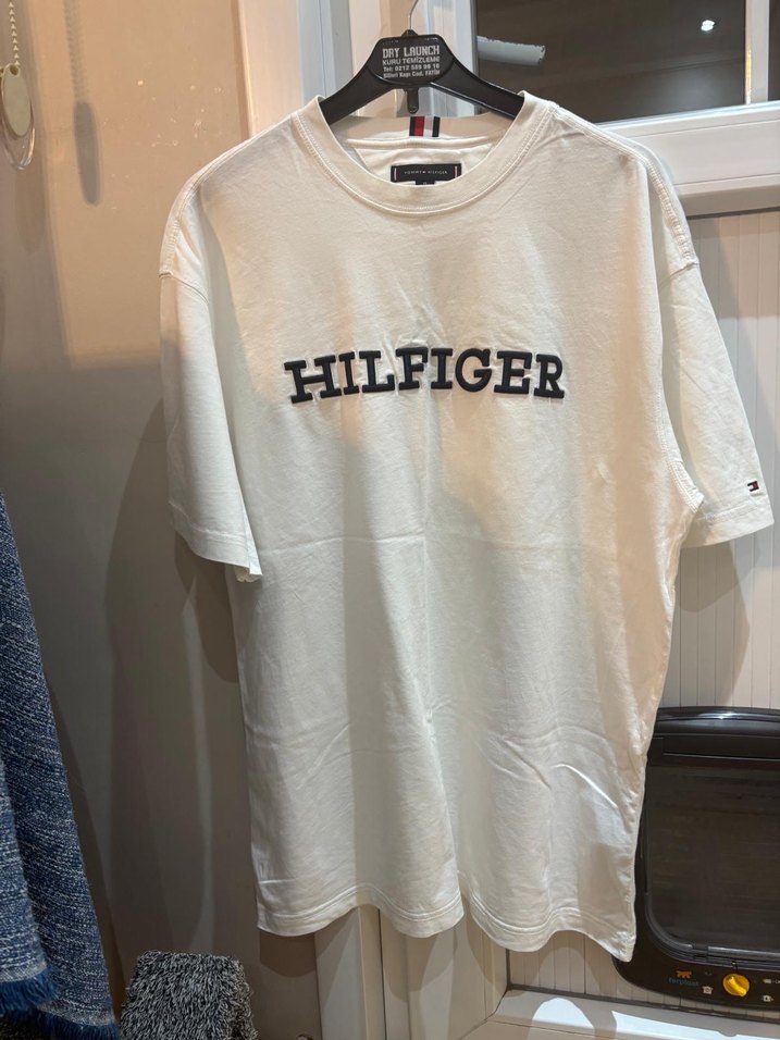 Tommy Hilfiger markalı, pamuklu kumaştan üretilmiş, rahat kesim ve kısa kollu beyaz tişört. Önünde baskılı logo ve yuvarlak yaka bulunur. M-L bedene uyar. Boy 75 cm - iki koltuk arası en 60 cm.