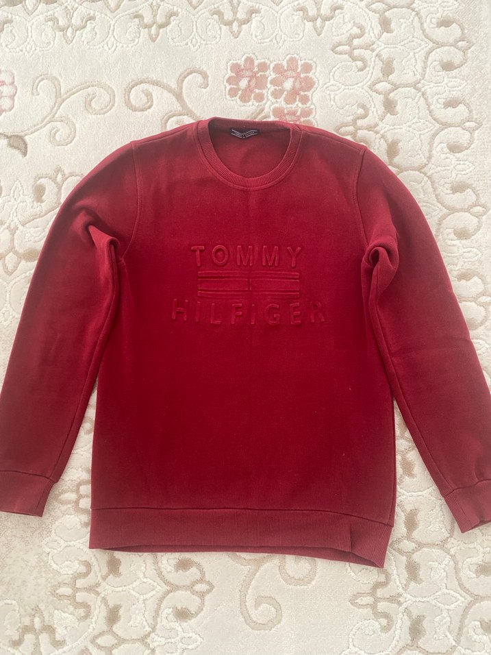 Tommy Hilfiger markalı, bordo renkli, uzun kollu, bisiklet yaka, baskılı ve örgü detaylı, rahat kesim erkek sweatshirt.