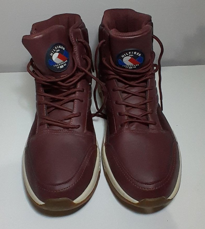 Tommy Hilfiger markalı, bağcıklı, desen içermeyen koyu bordo erkek botları.