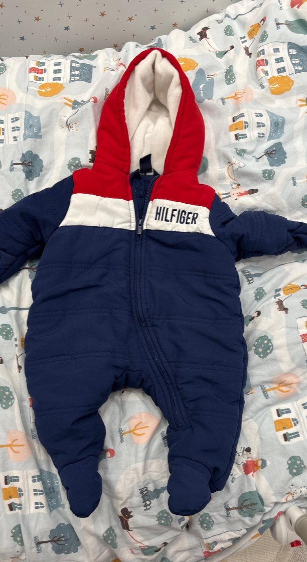 Çok renkli fermuarlı erkek bebek tulumu, yumuşak ve sıcak kumaştan üretilmiştir. Kapüşonlu ve göğsünde "HILFIGER" logosu vardır. ❄️ Çok az kullanıldı Amerikadan geldi