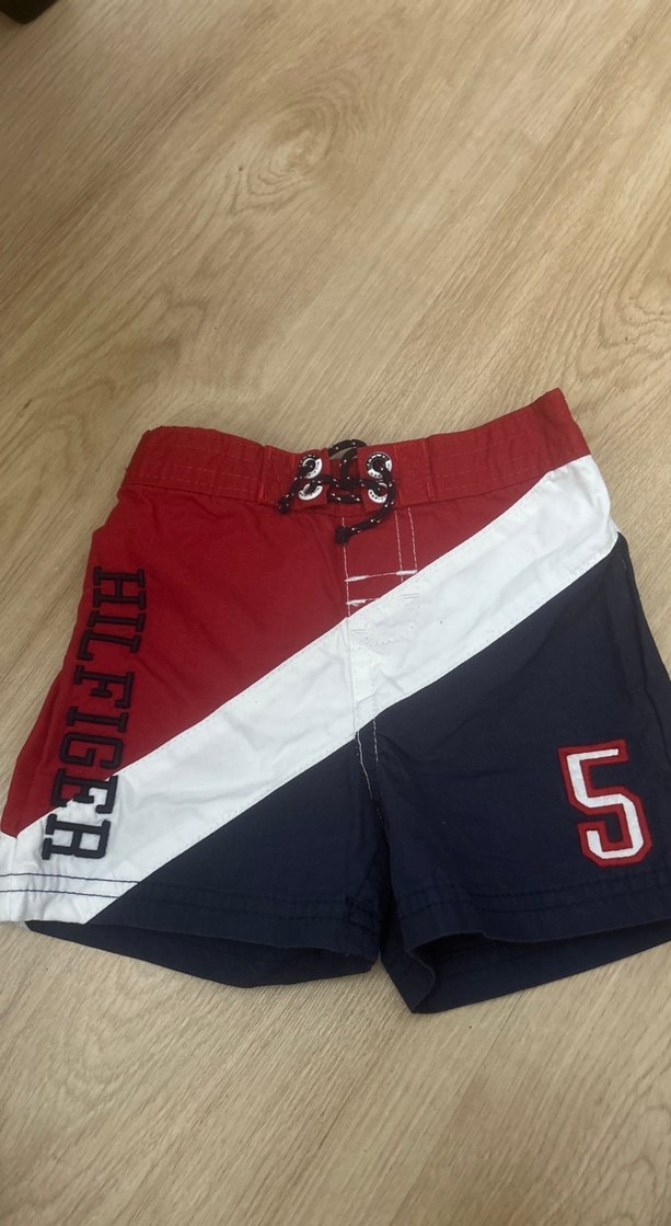 Kırmızı, siyah ve beyaz renklerde, baskılı desenli ve kemerli erkek çocuk şortu. "HILFIGER" logosu ve 5 numara detayısı var. Amerika’dan alındı.