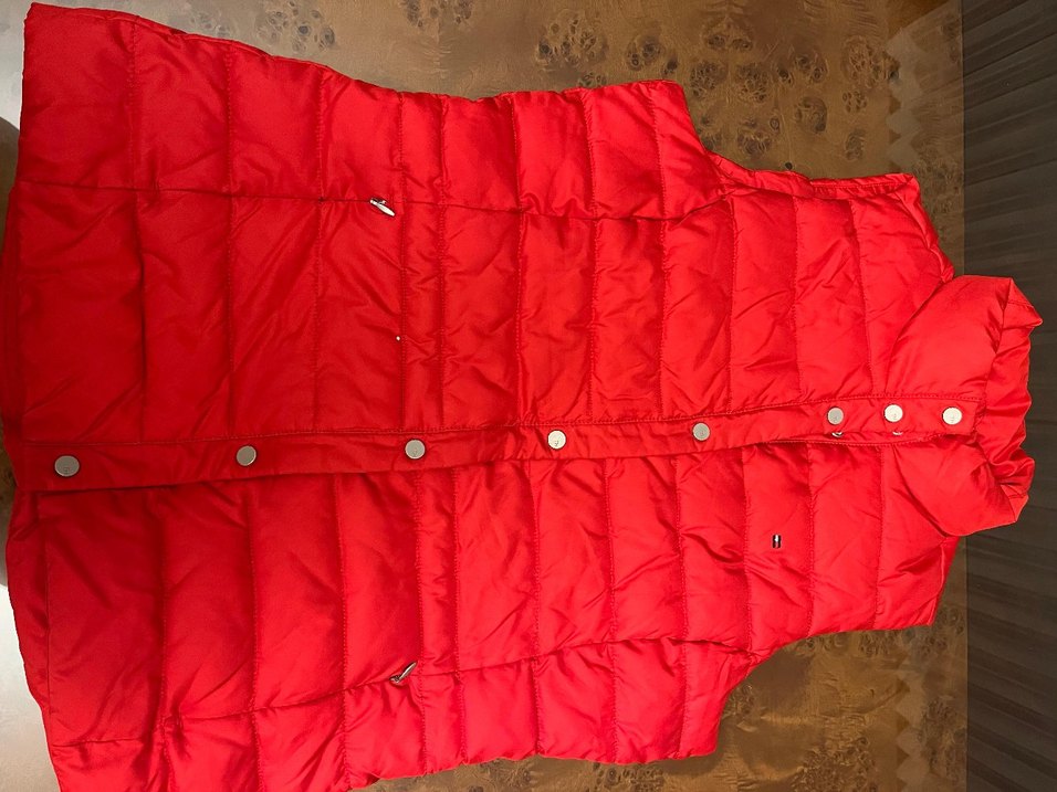 Düğmeli, kırmızı kadın şişme yelek, parlak kumaştan, kolsuz ve normal boyda, çıtçıtlı, sokak stiline uygun. Ürün orjinal Tommy markadır. Hediye geldiği için etiketi koparılmış hiç giyilmemiştir.