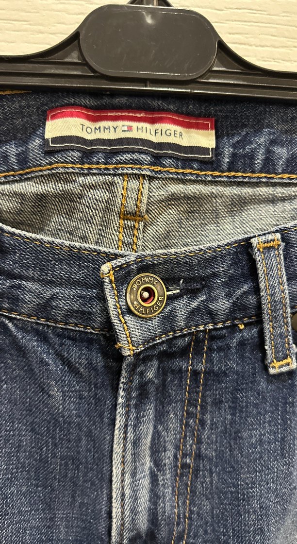 Tommy Hilfiger markalı, düğmeli, baskılı detaylara sahip lacivert kot pantolon, rahat kesimiyle günlük sokak stiline uygundur.