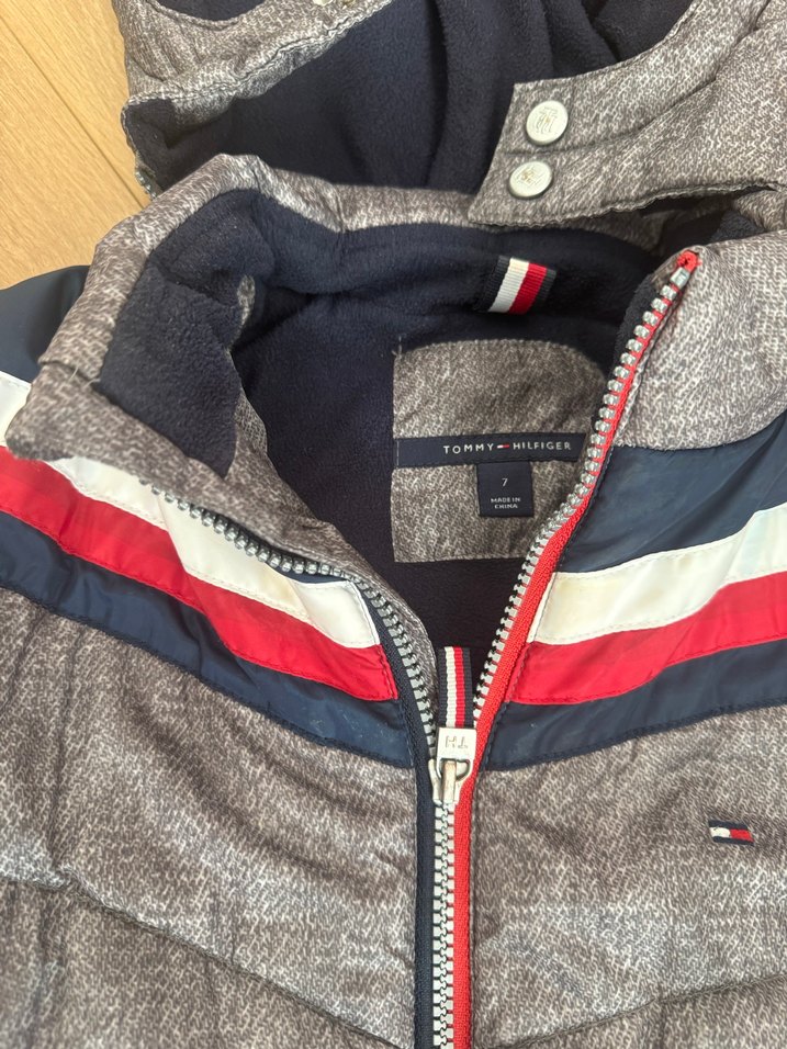 Tommy Hilfiger markalı, fermuarlı ve çentikli yakalı, gri renkli erkek çocuk montu. Sentetik kumaştan üretilmiş, sokak modasına uygun çizgilerle tasarlanmıştır. Ürün fotolarda görüldüğü gibidir, cep metal düğmelerinde hafif kararma ve kol kenar uçlarında hafif yıpranma var tommynin ikonik renk çizgileri var beyazında çok hafif sarımsı leke var